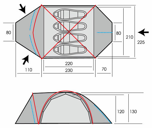 Purpose: camping, number of places: 4, features: UV protection, ventilation holes, wind / snow skirt, inside pockets, inner tent, canopy, taped seams, assembly type: outer frame