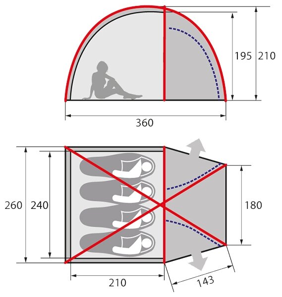 Purpose: camping, number of places: 4, features: ventilation holes, inner pockets, inner tent, windows, taped seams, assembly type: outer frame, awning water resistance: 5000 mm w.c. art., quantities