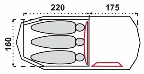 Purpose: camping, number of places: 4, features: UV protection, ventilation holes, wind / snow skirt, inside pockets, inner tent, canopy, taped seams, assembly type: outer frame