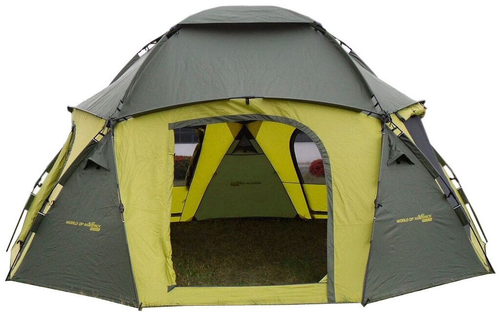 Type: tent, purpose: camping, shape: hemisphere, features: quick assembly, ventilation windows, windproof skirt, waterproof, windows, welded seams, reinforced corners, number of entrances: 5, equipment: