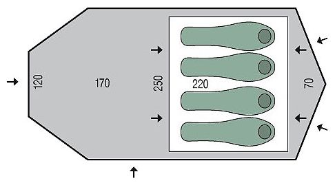 Purpose: camping, number of places: 4, features: UV protection, ventilation holes, wind / snow skirt, inside pockets, inner tent, canopy, taped seams, assembly type: outer frame