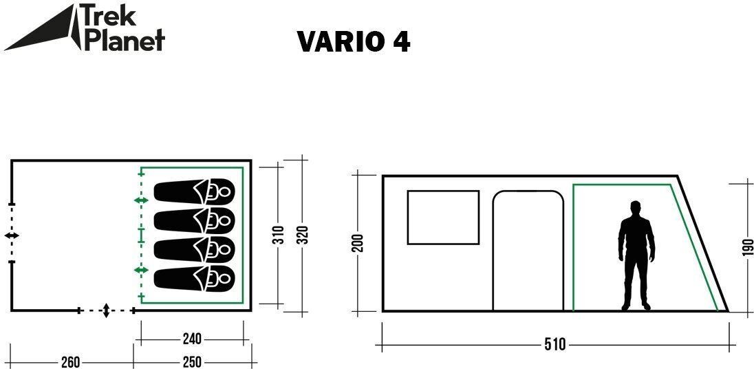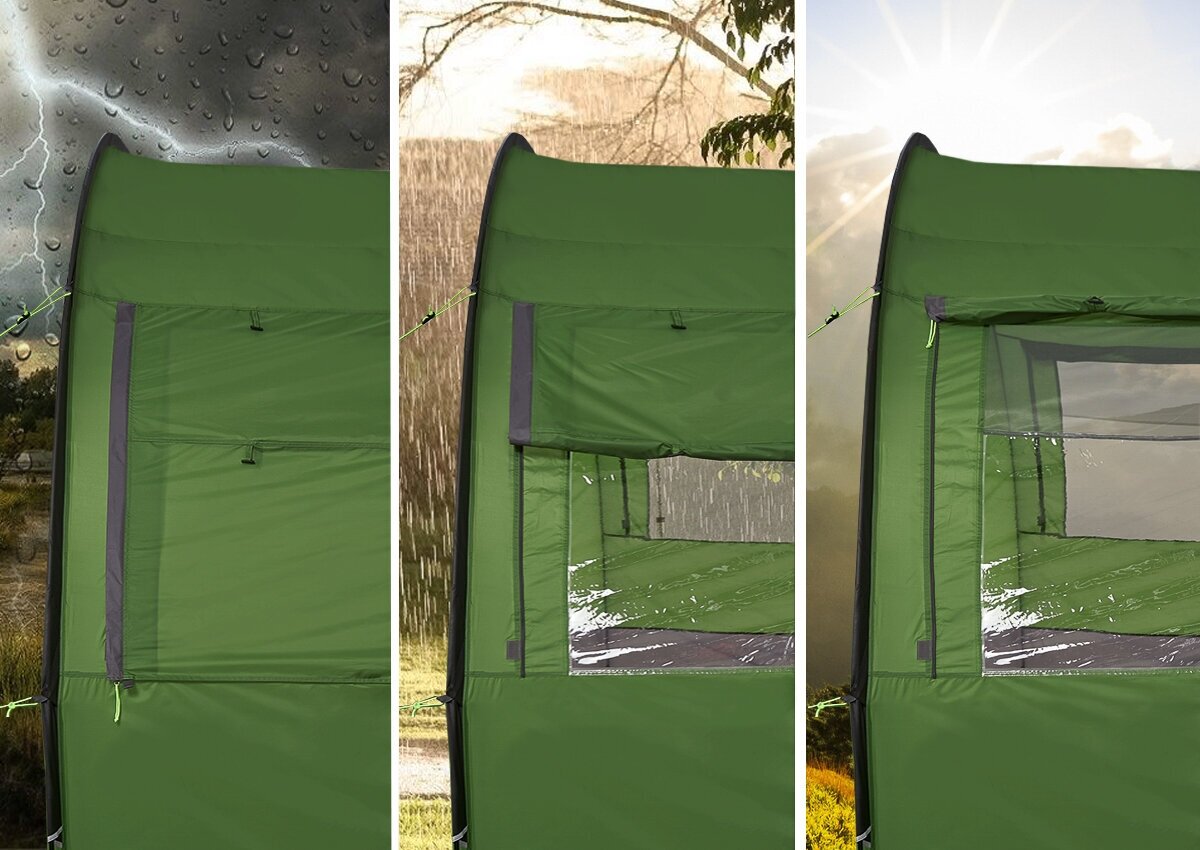 Purpose: camping, number of places: 4, features: UV protection, vents, wind / snow skirt, inside pockets, inner tent, windows, taped seams, assembly type: outer frame,