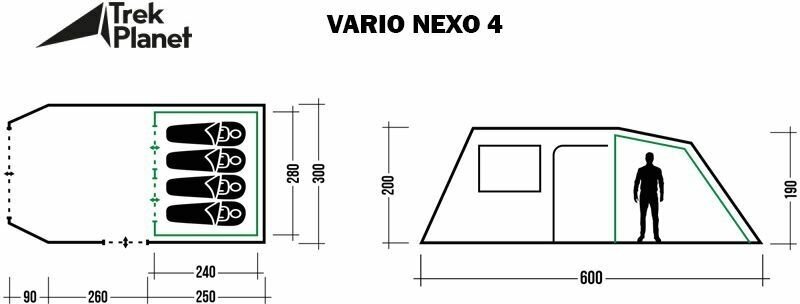Purpose: camping, number of places: 4, features: air vents, wind / snow skirt, inside pockets, inner tent, windows, taped seams, build type: external frame, water resistant