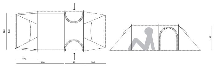 Purpose: camping, number of places: 4, features: UV protection, ventilation holes, wind / snow skirt, inside pockets, inner tent, canopy, taped seams, assembly type: outer frame