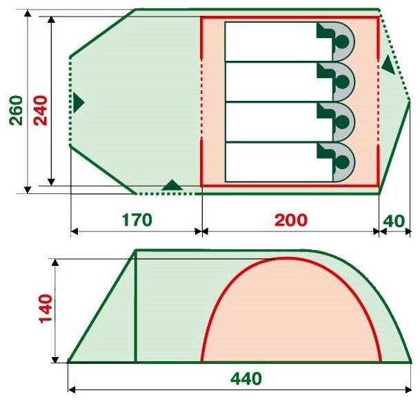 | Inner tent dimensionsLxWxH: |