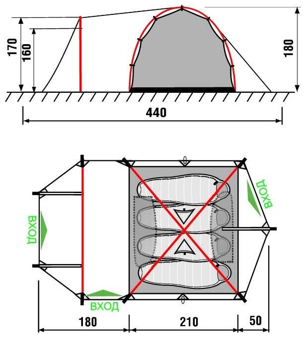 Purpose: camping, number of places: 4, features: ventilation holes, wind / snow skirt, inside pockets, inner tent, canopy, taped seams, reinforced corners, build type: inner