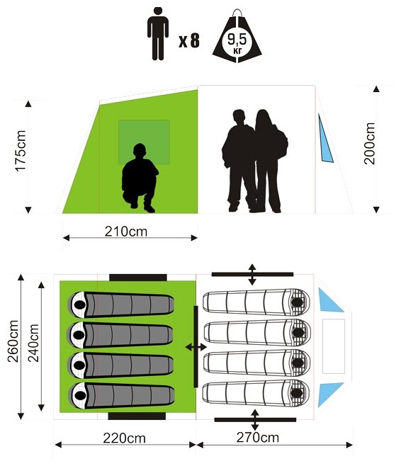 Purpose: camping, number of seats: 7 or more, features: ventilation holes, wind / snow skirt, inside pockets, inner tent, canopy, windows, taped seams, assembly type: outer car