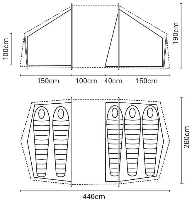 Purpose: trekking, number of places: 5, features: ventilation holes, inner pockets, inner tent, assembly type: outer frame, number of rooms: 2, number of vestibules: 1, weight: 5.39 kg, equipment