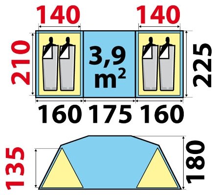 Purpose: camping, number of places: 4, features: UV protection, ventilation holes, inside pockets, inner tent, welded seams, assembly type: outer frame, number of rooms: 2, number of vestibules