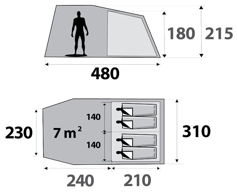 Purpose: camping, number of places: 4, features: UV protection, ventilation holes, inside pockets, inner tent, canopy, windows, taped seams, reinforced corners, build type: inner frame, inflatable