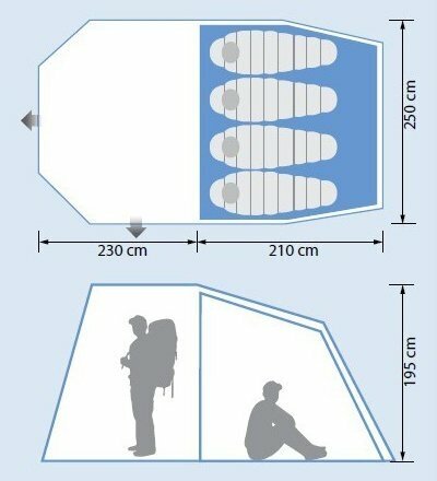 Purpose: camping, number of places: 4, features: ventilation holes, wind / snow skirt, inside pockets, inner tent, canopy, welded seams, build type: external frame, waterproof