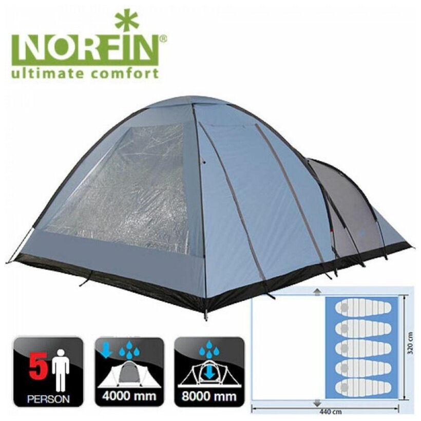 Purpose: camping, number of places: 5, features: ventilation holes, wind / snow skirt, inside pockets, inner tent, canopy, welded seams, build type: external frame, waterproof