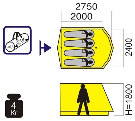 Purpose: camping, number of places: 4, features: UV protection, ventilation holes, wind / snow skirt, inside pockets, inner tent, canopy, taped seams, assembly type: outer frame