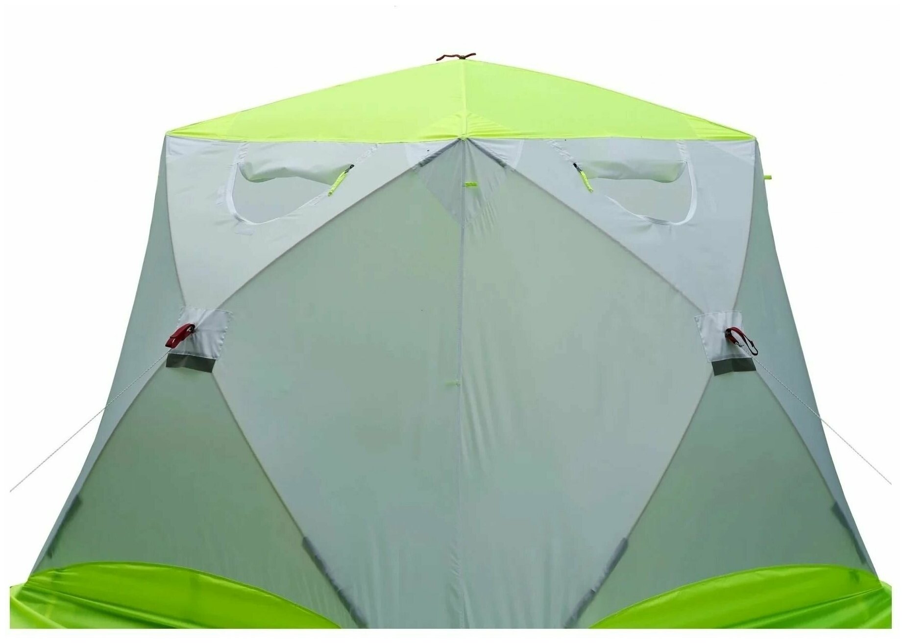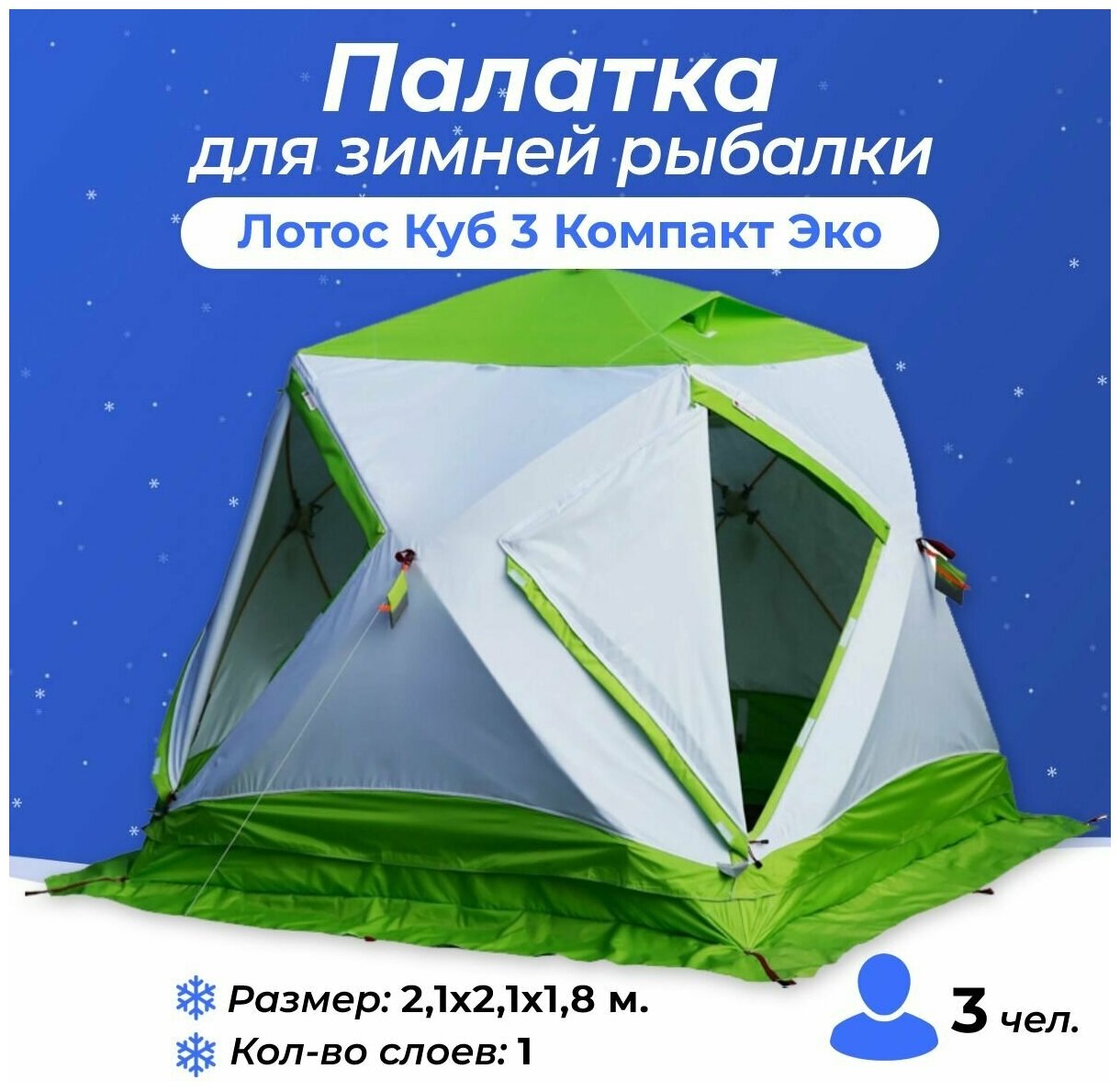 Purpose: for fishing, number of seats: 3, features: ventilation holes, wind / snow skirt, inside pockets, fireproof impregnation, windows, assembly type: quick assembly, inner frame, waterproof