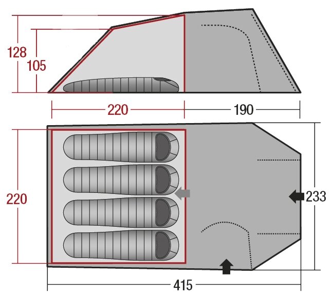 Purpose: camping, number of places: 4, features: UV protection, ventilation holes, wind / snow skirt, inside pockets, inner tent, canopy, taped seams, assembly type: outer frame