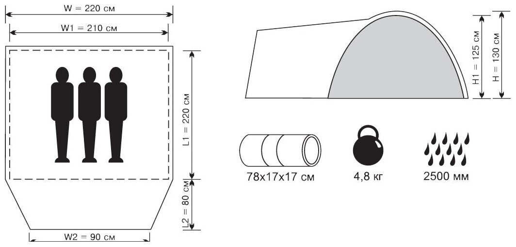 Purpose: trekking, number of places: 3, features: UV protection, ventilation holes, inner tent, taped seams, assembly type: quick assembly, outer frame, awning water resistance: 2500 mm w.c. art., quantities