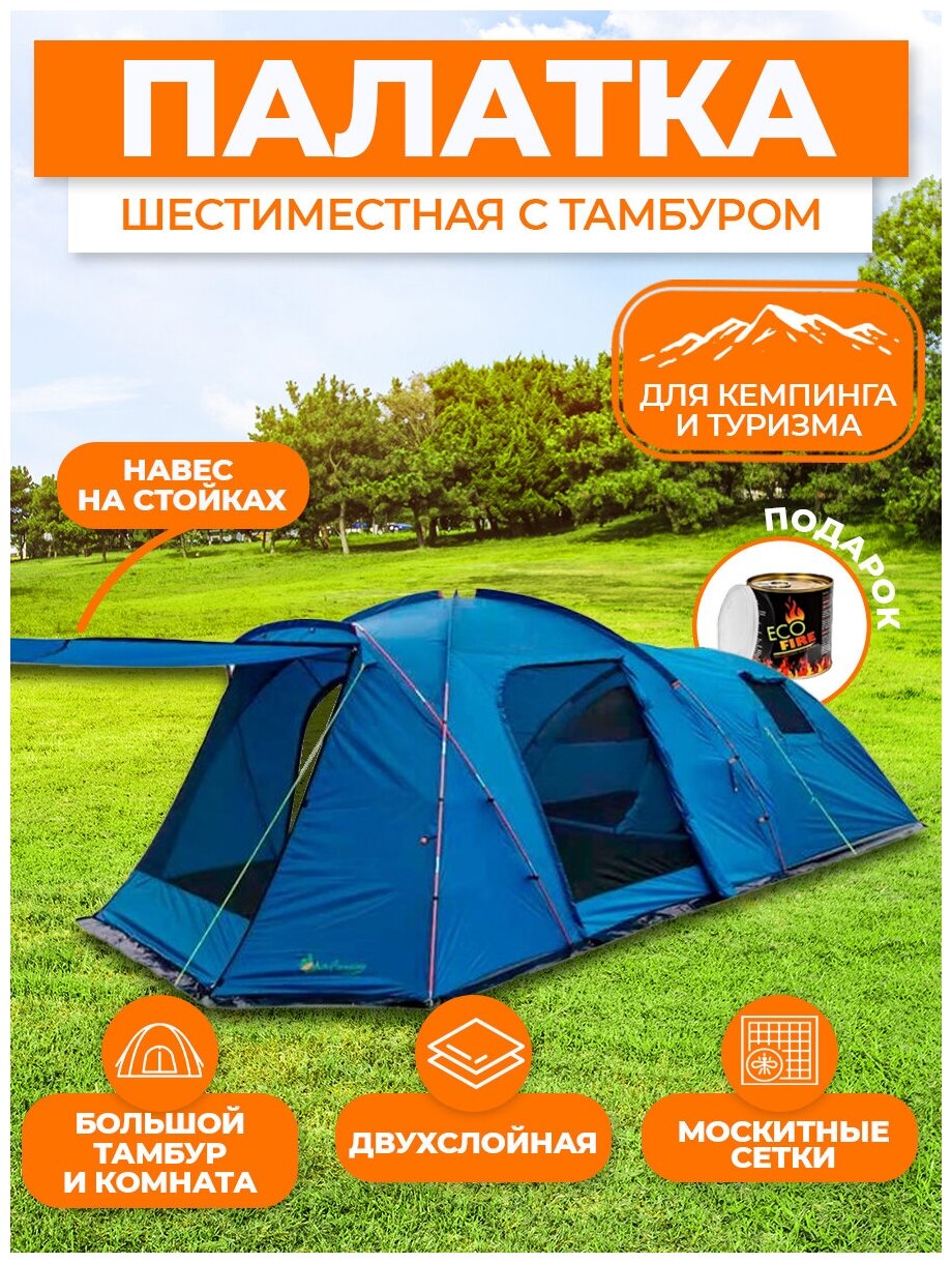 Purpose: camping, number of places: 6, features: windows, water resistance of the awning: 5000 mm of water. Art., number of rooms: 2, number of vestibules: 1, weight: 15 kg, water resistance of the bottom: 3000 mm of water. Art., frame material: fiberglas