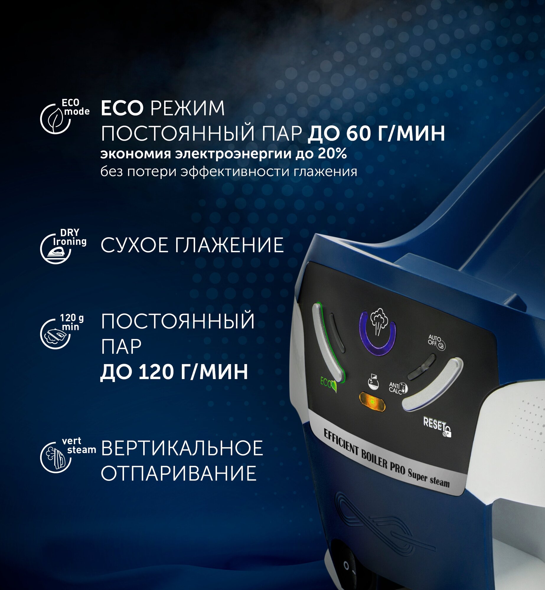 Power: 2500 W, additional functions: anti-calc, steam boost, constant steam supply, steam supply regulation, self-cleaning system, spray function, vertical steaming, soleplate material: ceramic
