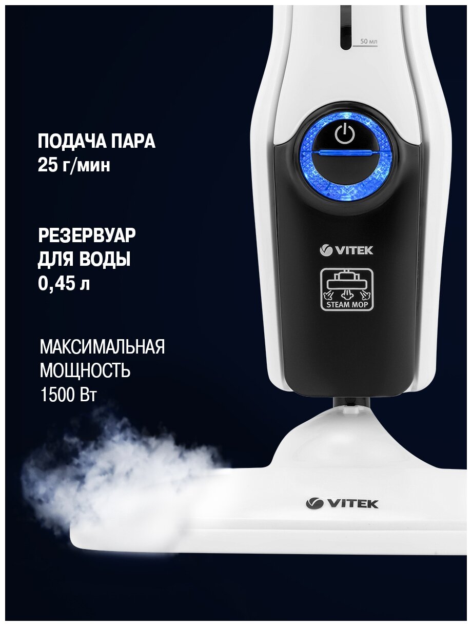 Type: steam mop, design: floor-mounted, power: 1500 W, water tank volume: 0.45 l, features: low water cut-off, fine filter, design features: removable water tank