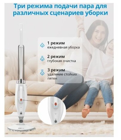 Type: steam mop, design: floor standing, power: 1500 W, water tank volume: 0.42 l, additional functions: steam supply adjustment, features: shutdown in case of lack of water, design features: control keys