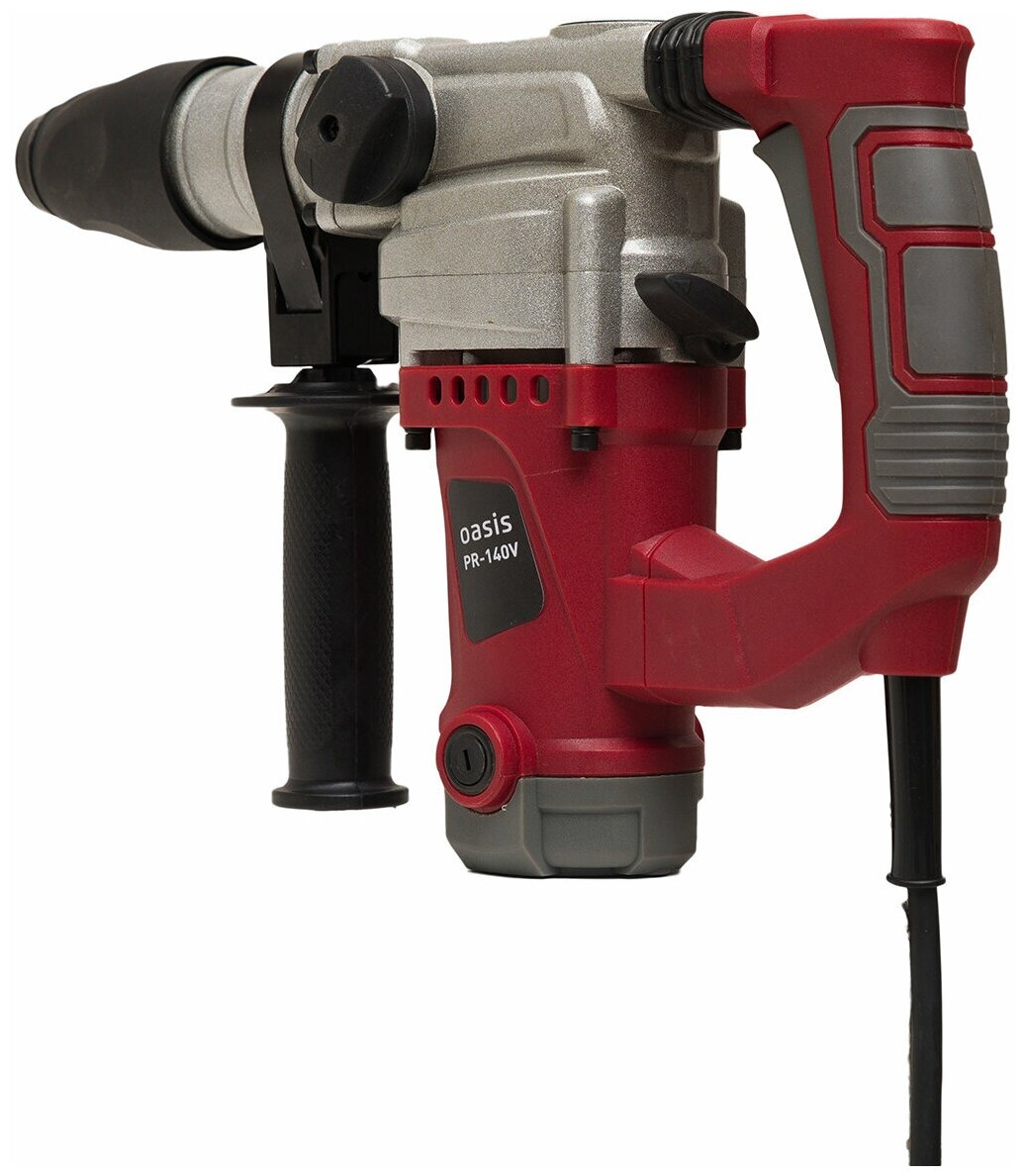 Hammer drill, case, additional handle, pointed chisel 14×250 mm, flat chisel 14×250 mm, set of three drills 8/10/12×150 mm, lubricant, dust cover, drilling depth gauge, wrench, carbon brush – 2 pcs. ., hand
