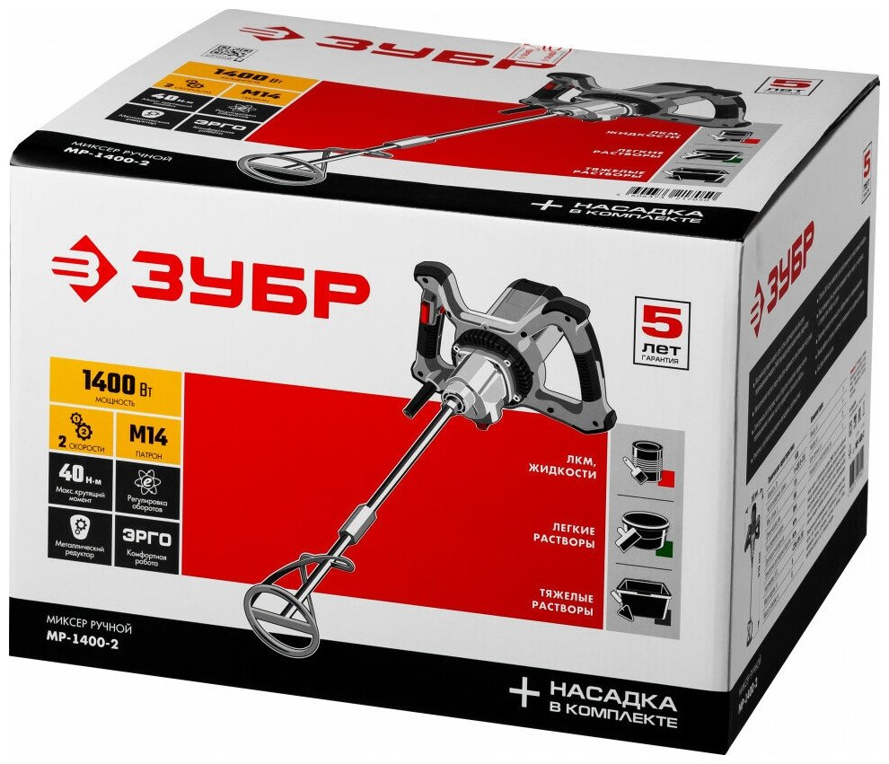 Construction mixer ZUBR MR-1400-2, 2-speed, 1400 W, 13 Nm, 0-620 / 0-810 rpm, M14 chuck, up/down mixing