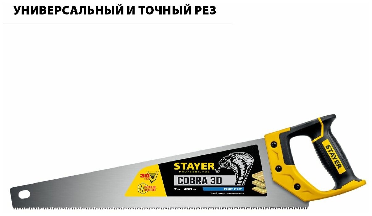 Type: wood saw, processing material: wood, blade length: 500 mm, hardened teeth, saw direction: longitudinal-cross, tooth size: medium, tooth pitch: 3.5, 3D sharpening, handle: fixed