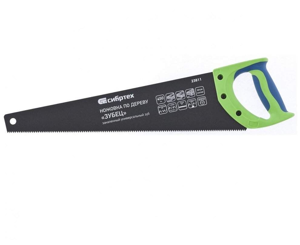 Type: hacksaw, processing material: wood, blade length: 450 mm, blade material: carbon steel, hardened teeth, teflon coating, tooth size: medium, tooth pitch: 7-8, handle: fixed