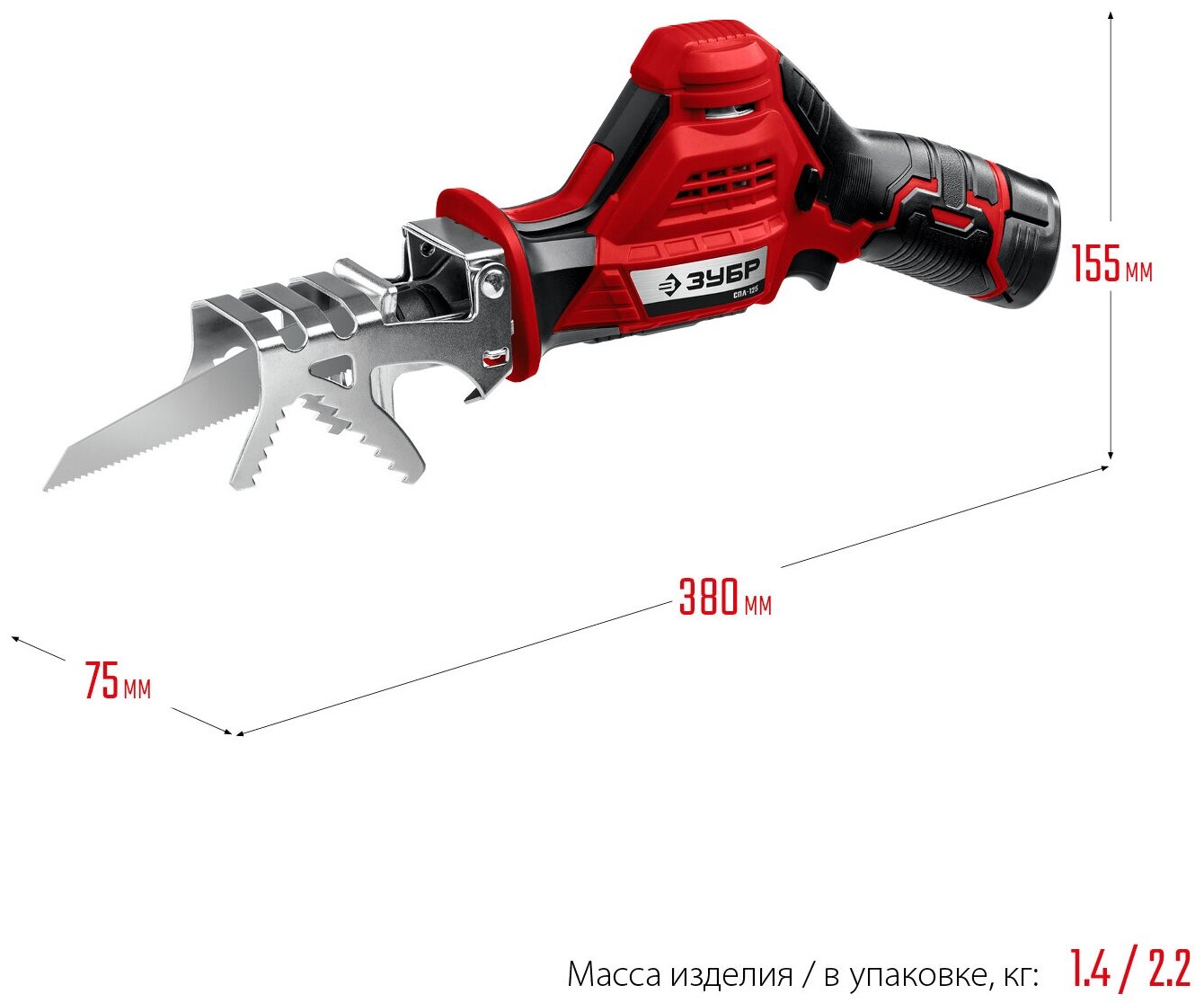 Reciprocating saw, battery 2 pcs., charger, a-shaped stop, instruction manual