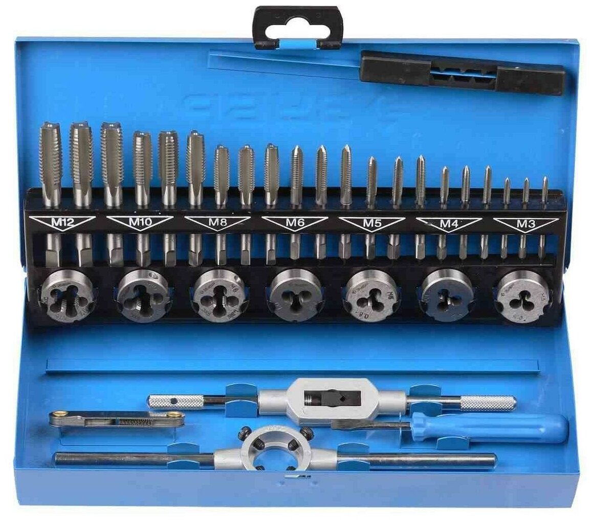 - taps complete of 3 pieces M3x0.5, M4x0.7, M5x0.8, M6x1.0, M8x1.25, M10x1.5, M12x1.75;<br/>