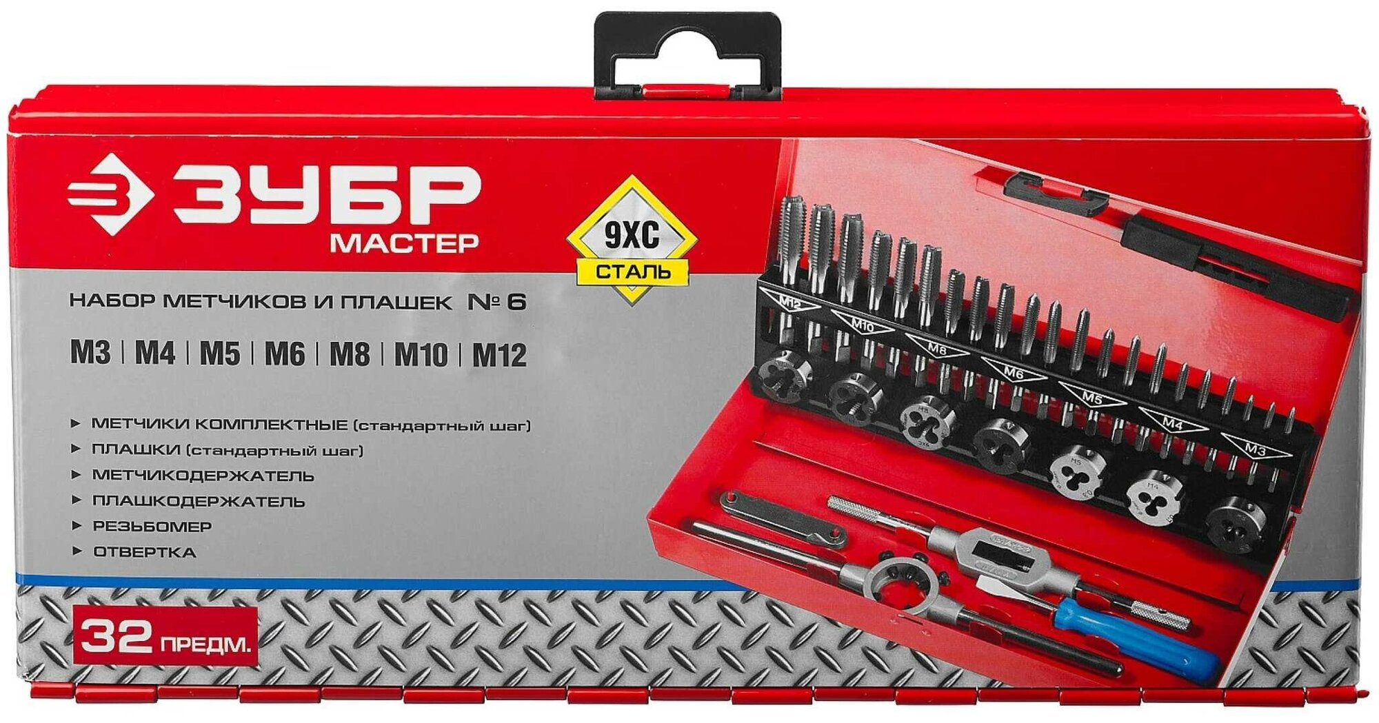 Type: a set of taps and dies, thread type: metric M, material: 9XC, thread direction: right, metric thread diameter: M10, M12, M3, M4, M5, M6, M8, thread pitch: 0.5, 0.7, 0.8, 1.0 , 1.25, 1.5, 1.75, number of items: 32 pieces, minimum