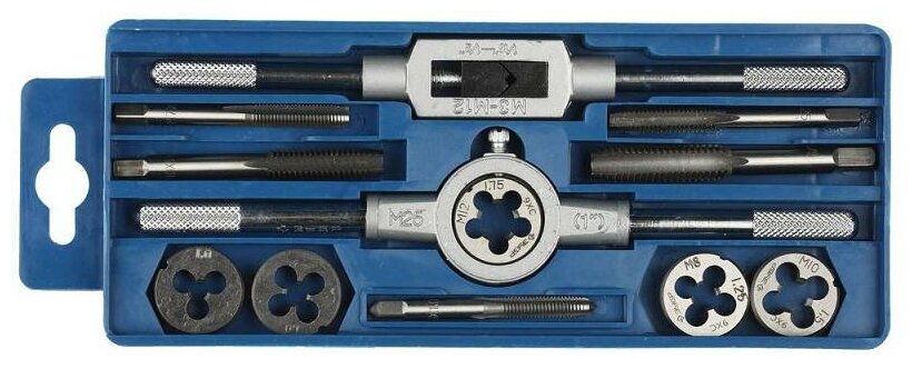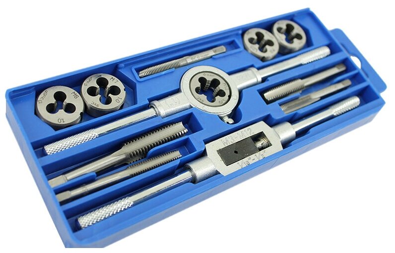 - 5 taps and 5 dies: M6x1.0, M7x1.0, M8x1.25, M10x1.5, M12x1.75;<br/> - tap holder M3-M12;<br/> - die holder D25 M3-M12;<br/> - plastic box.