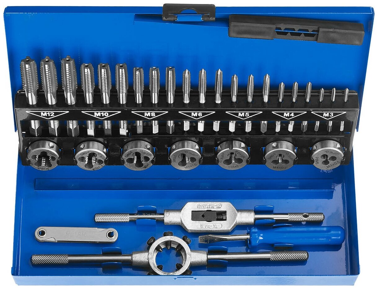 Type: set of taps and dies, material: HSS, metric thread diameter: M5, number of items: 32 pcs.