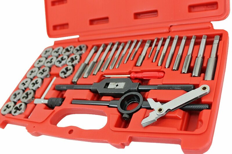 Type: a set of taps and dies, thread type: metric M, pipe G, material: 9XC, thread direction: right, metric thread diameter: M10, M12, M3, M4, M5, M6, M7, M8, thread pitch: 0.5, 0.6, 0.7, 0.75, 0.8, 0.9, 1.0, 1.25, 1.5, number of items