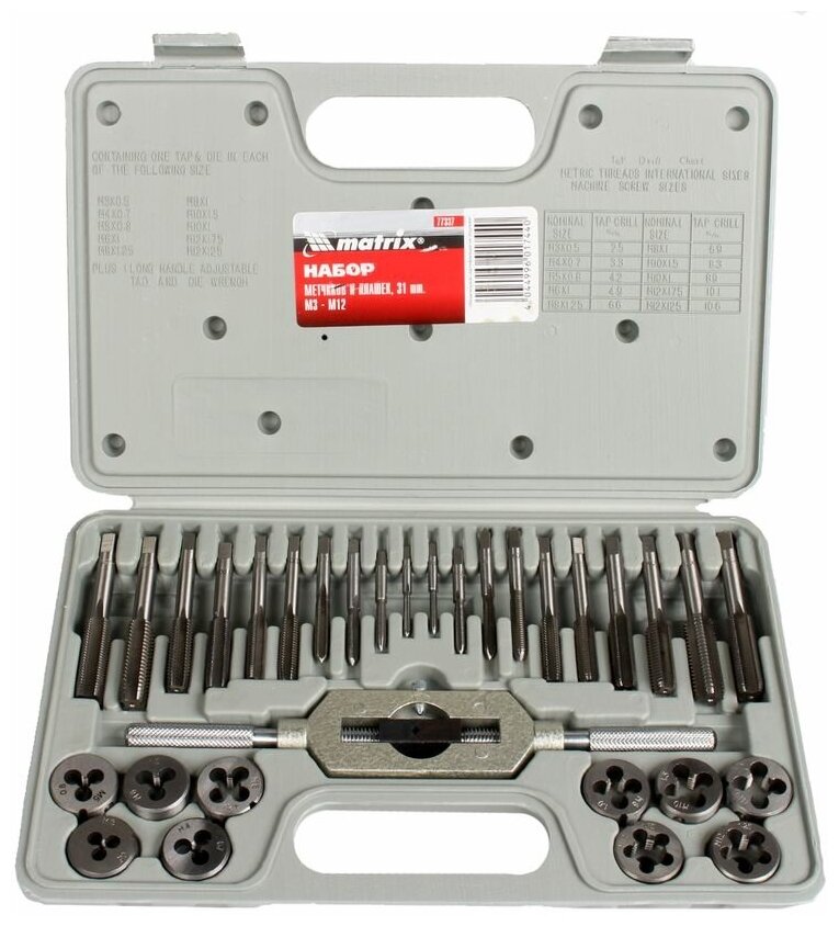 Type: a set of taps and dies, thread type: metric M, material: 9XC, thread direction: right, metric thread diameter: M10, M12, M3, M4, M5, M6, M8, thread pitch: 0.5, 0.7, 0.8, 1.0 , 1.25, 1.5, 1.75, number of items: 31 pieces, area approx.
