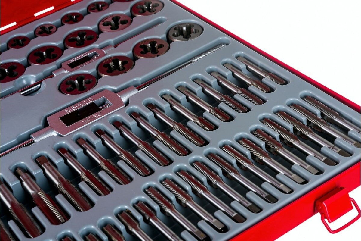 Type: set of taps and dies, thread type: metric M, material: tool steel, thread direction: right, metric thread diameter: M10, M12, M3, M4, M5, M6, M8, thread pitch: 0.5, 0.7, 0.8, 1.0, 1.25, 1.5, 1.75, number of items