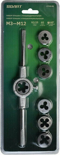 Description of the set of dies volat 8 items 87520-08 The set of dies is designed for cutting internal threads of different diameters, types and pitches in through and blind holes. Complete set Dies: 7 pcs.