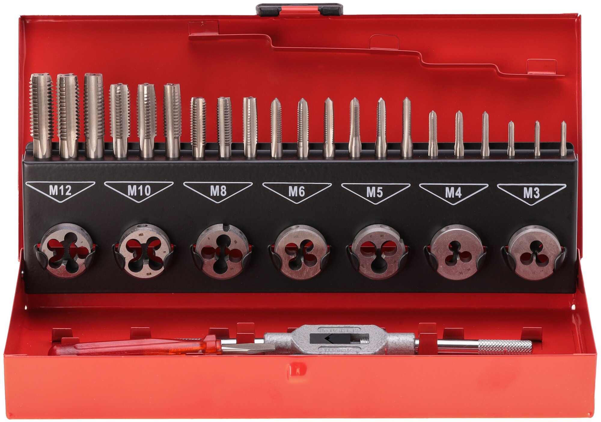 Hand taps, 3 each: M 3, M 4, M 5, M 6, M 8, M 10, M 12 Dies, diameter 25 mm, DIN EN 22568: M 3, M 4, M 5, M 6, M 8, M10, M12