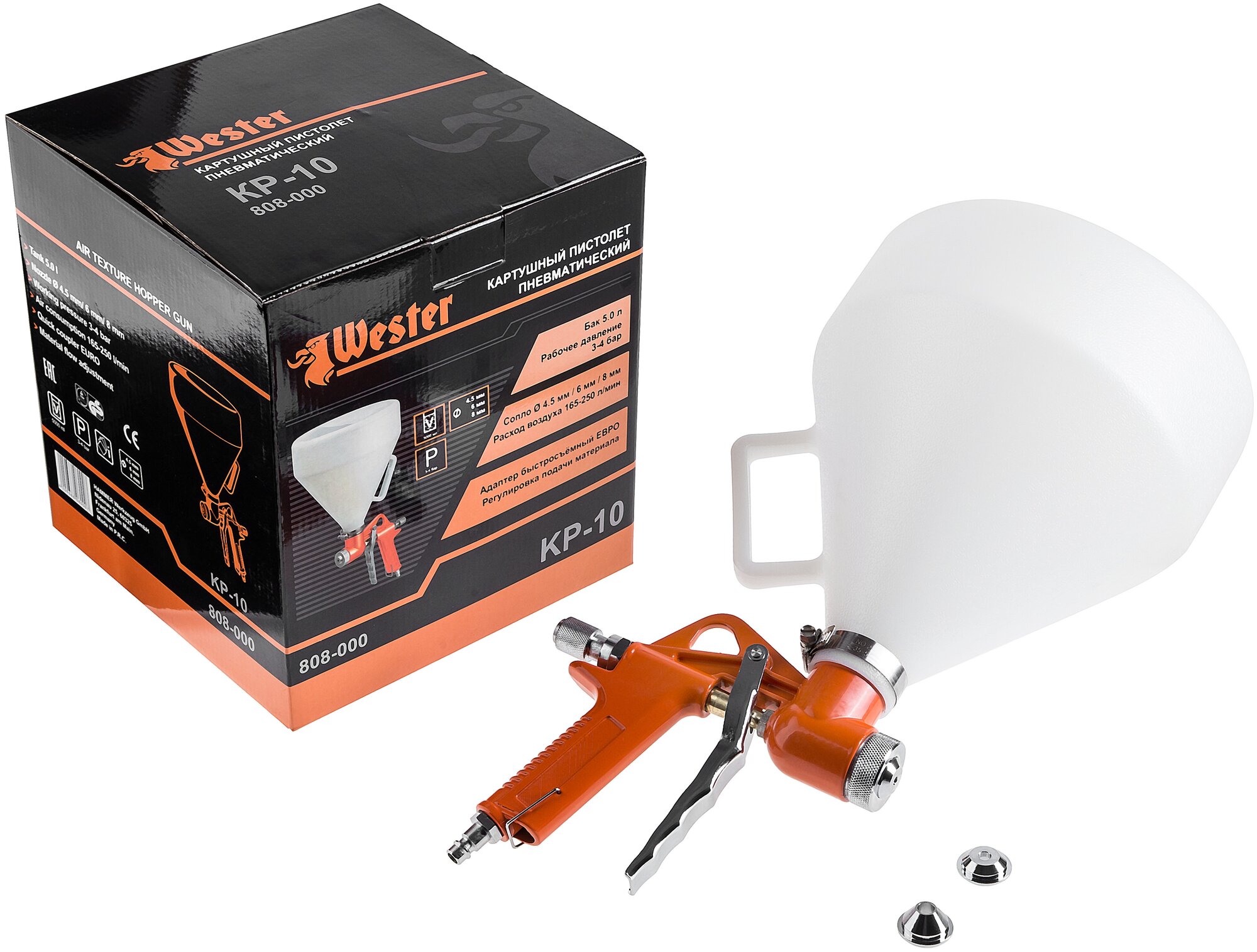 Type: texture gun, tank volume: 5 l, material flow adjustment, nozzle diameter adjustment, maximum nozzle diameter: 8 mm