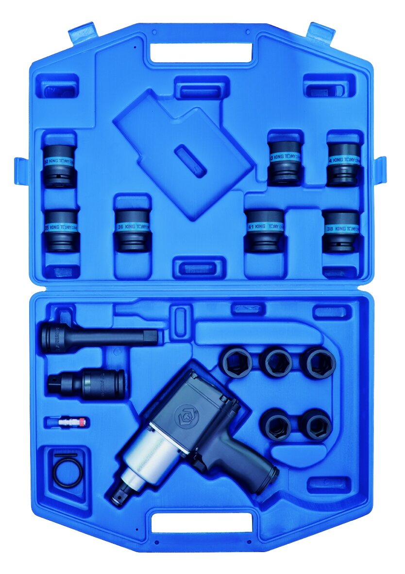 3/4" hexagon impact sockets 6535M: sizes 19, 21, 22, 24, 27, 30, 32, 33, 34, 36, 38, 41 mm; impact extension 3/4", 175 mm KING TONY 6260-07 ; shock cardan 3/4", ball KING TONY 6797; quick-detachable fitting SY-221M; set of clamps: 90603, 90404