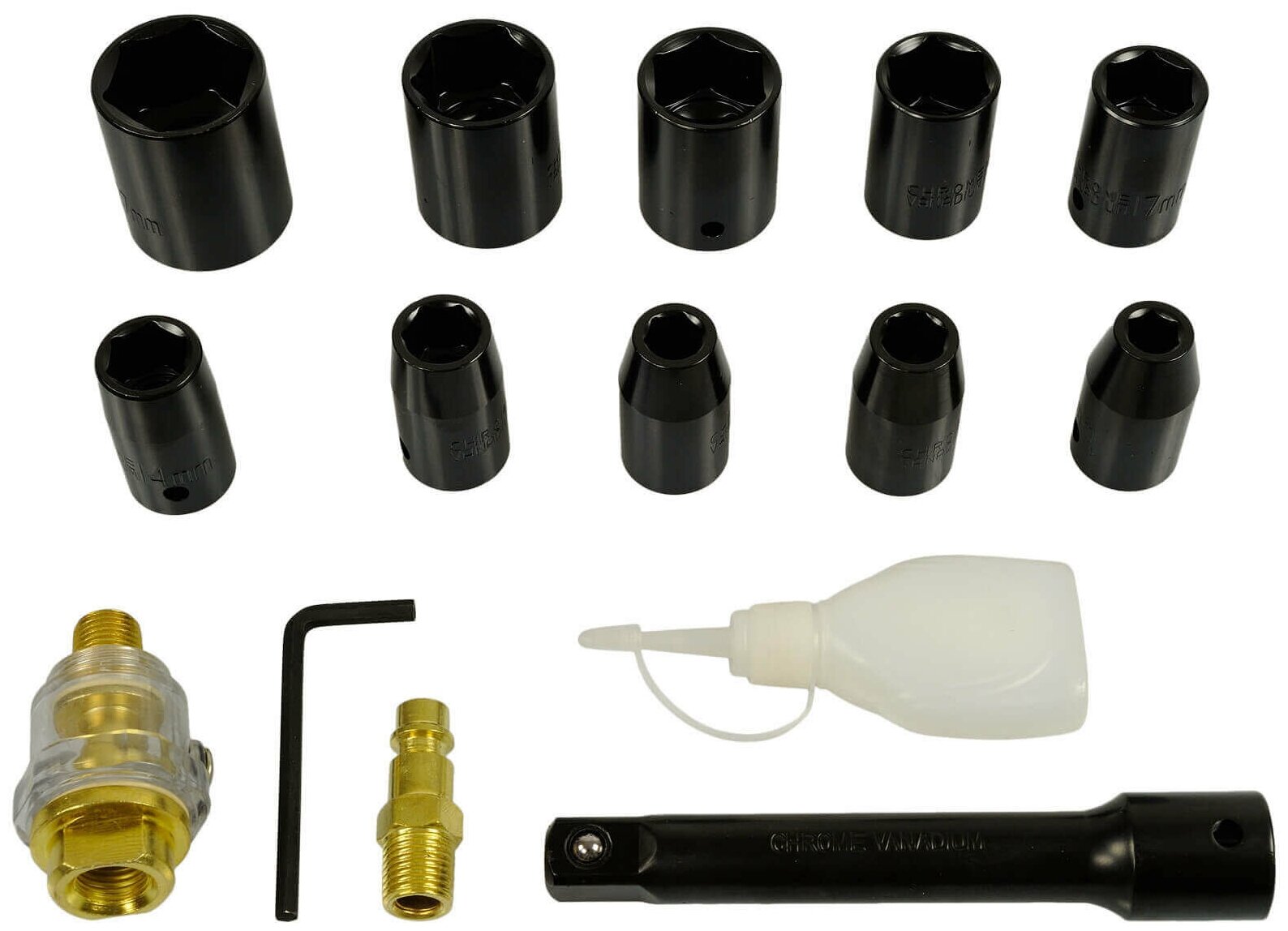 Nozzles: SW 9, 10, 11, 13, 14, 17, 19, 22, 24, 27 mm., fitting, oiler, 100 mm extension, mini-lubricator, hex key
