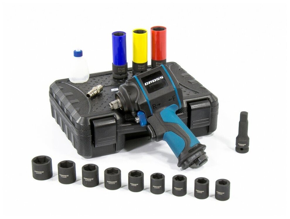 Oiler, inlet fitting, extension cord, set of heads - 9 pcs 13; 14; 15; 16; 17; 18; 19; 21; 24 mm, a set of impact heads - 3 pcs 17; 19; 21 mm