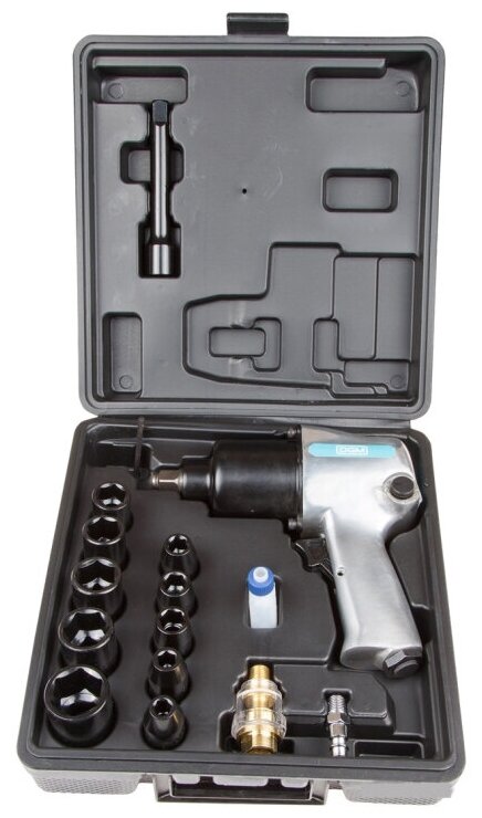 Interchangeable impact heads 1/2": 9,10,11,13,14,17,19,22,24,27 mm., impact extension 1/2" 125mm, mini-lubricator, hex key, nipple, air tool oil