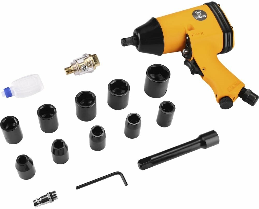 1/2 Impact wrench 1 pc. 1/2 wrench 10 pcs. 1/2 sockets: 9,10,11,13,14,17,19,22,24,27mm 1pc 1/2 to 5 extension 1pc oiler 1pc 4mm hex wrench 1pc striker 1 piece air tool oil