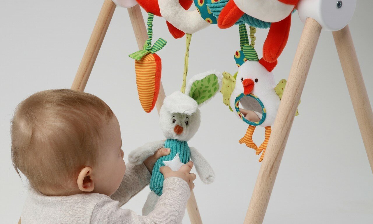 Type: hanging toy, effects: sound, educational elements: mirror, squeaker, rattle, tactile inserts, rustling and crispy elements, material: plastic, textile