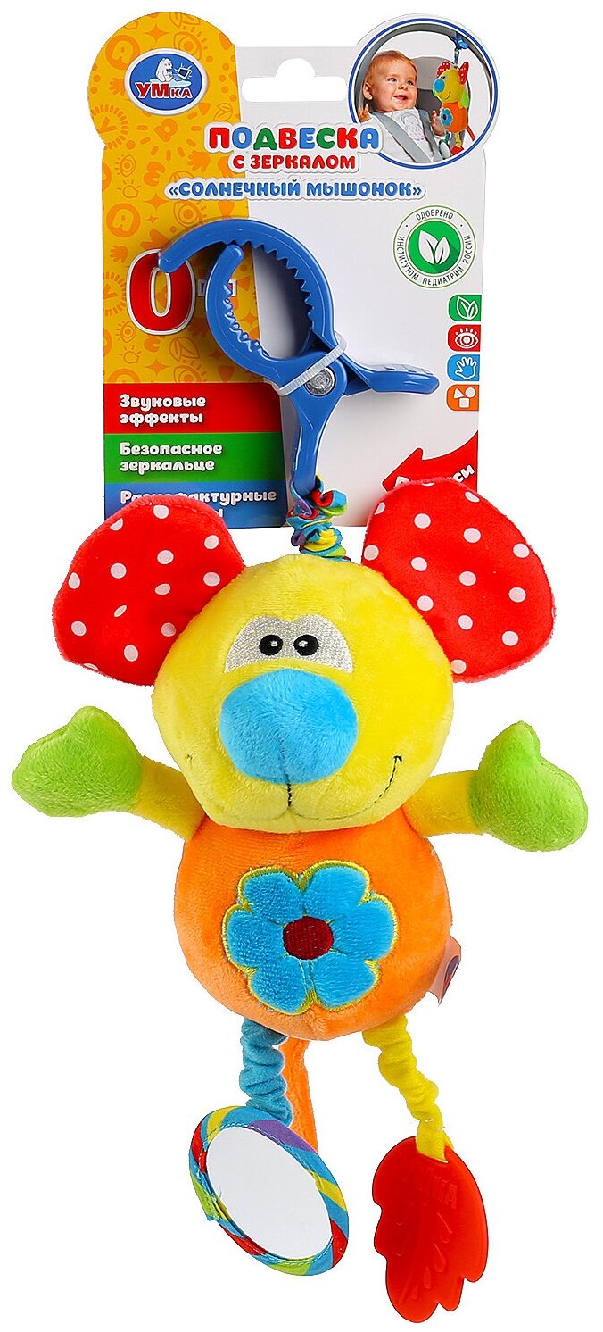 Type: hanging toy, effects: vibration, sound, educational elements: mirror, teether, tactile inserts, rustling and crispy elements, material: plastic, textile
