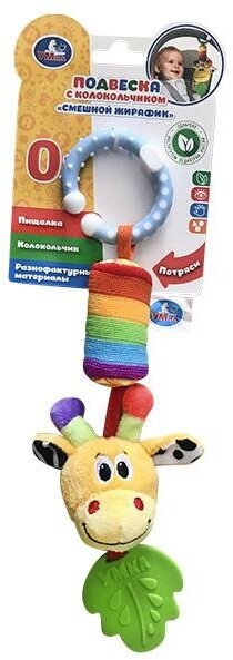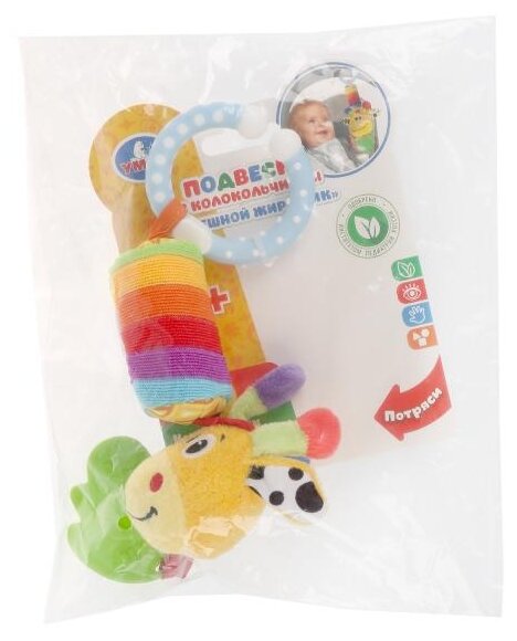 Type: hanging toy, effects: sound, educational elements: bell, squeaker, teether, tactile inserts, material: plastic, textile