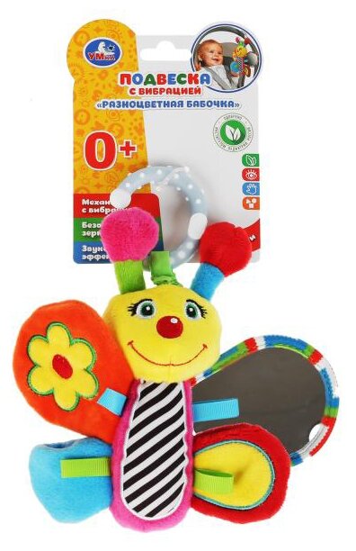 Type: hanging toy, effects: sound, educational elements: mirror, rattle, tactile inserts, rustling and crunchy elements, material: plastic, textile