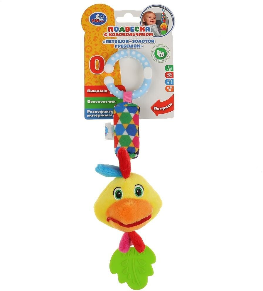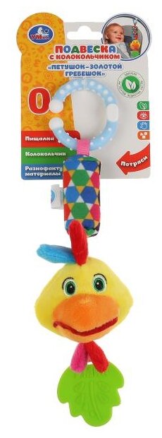 Type: hanging toy, effects: sound, educational elements: bell, squeaker, teether, tactile inserts, material: plastic, textile