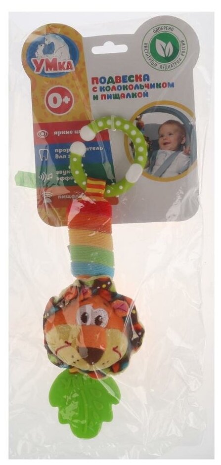 Type: hanging toy, effects: sound, educational elements: bell, squeaker, teether, tactile inserts, material: plastic, textile